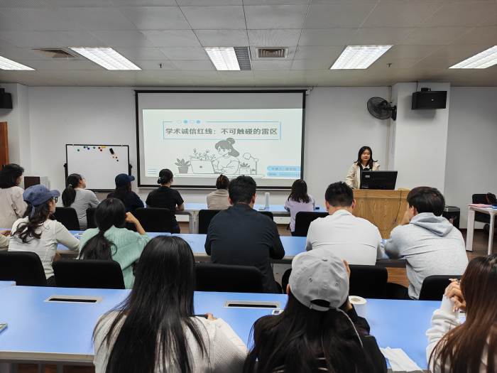 在交流分享环节,2024级翻译硕士研究生蒙贤玥同学、2025级翻译硕士研究生王子伦同学以“青年科研者的初心与使命”为切入点,阐述了学术规范对个人成长的意义,表示:“作为科研新人,我们需从第一堂课、第一篇论文做起,将诚信内化为习惯。”